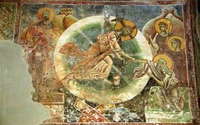 | Keywords: Sleguvanje od Pekolot Kurbinovo.jpg ru Х истос победитель ада Это понимание от ажено в иконах и ф есках посвященных сошествию во ад а ф еске «Сошествие во ад» из македонской це кви Ку биново XII в в уент е изоб ажен Х истос в ст емительном движении; п авой укой он де жит за уку Адама; в левой уке у его к ест с те новым венцом; голова наклонена к Адаму; гиматий азвевается на вет у Фигу а Х иста вписана в к уг азделенный восьмью лучами света на восемь сегментов; нап авление основных линий об азующих фигу у совпадает с нап авлением лучей что п идает всей композиции почти геомет ическую п авильность и ст огую п опо циональность http //www pravmir ru/uploads/kurbin_descent jpg Author century 12 PD-Macedonia Paintings in St George's Church Kurbinovo Orthodox frescos of Harrowing of hell |