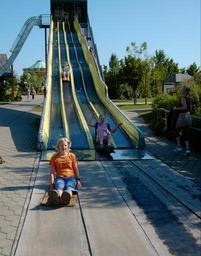 Keywords: slide slip girl children playground fun sky blue summer sun youth frisch fromm cheerful free yellow orange beautiful sunshine green bag train down munter shadow light shadow play human personal
