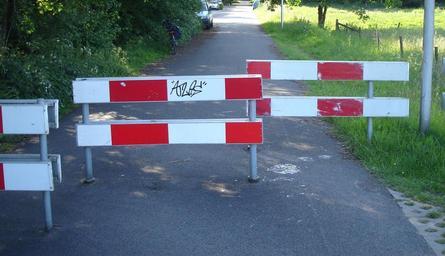 Keywords: Slingerhek2.JPG en Barrier to allow narrow vehicles only Own Handige Harrie 2009-05 PD Gates in unidentified countries Transport infrastructure Pedestrian chicanes