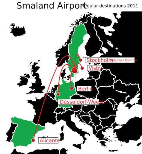 | Keywords: Smaland airport regualr destinations.svg en A map over the flight destinations from Smaland Airport sv Karta över destinationerna från Smaland Airport own Johannesgustafsson 2011-04-06 Cc-zero Småland Airport Maps of cities served by flights from given airport Transport maps of Europe |