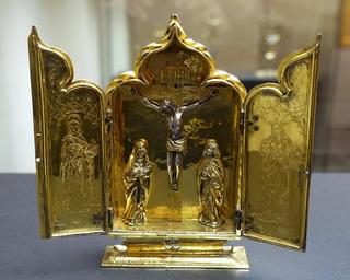 | View Original: | Small folding altar with crucifix scene, Cologne, c. 1500, copper, gilt and partially coated with silver - Museum Schnütgen - Cologne, Germany - DSC00123.jpg (4469x3576) | |||