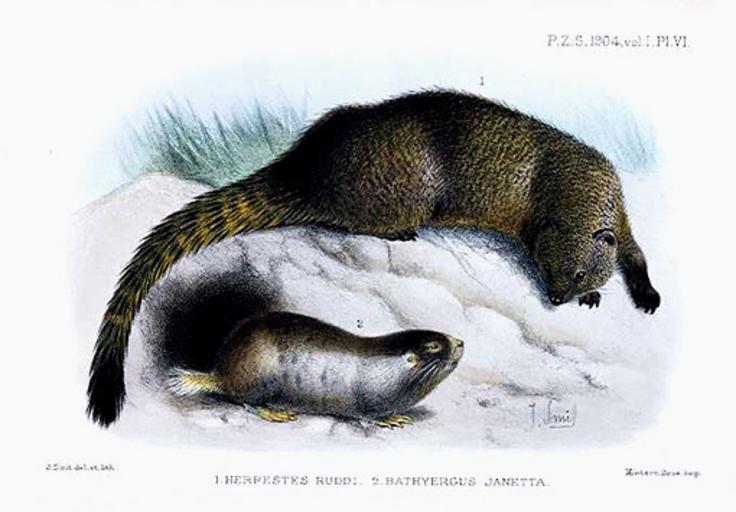 Keywords: Smit.herpestes ruddiand Bathyergus janetta.jpg Herpestes ruddi and Bathyergus janetta source http //www classicnatureprints com/pr Smit 20Mammals/smith Herpestes ruddi html artist Joseph Smit PD-old Unidentified Herpestes Bathyergus janetta PZSL 1904 |