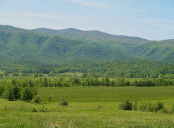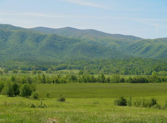 Keywords: tennessee smokies smoky mountains valley mountains landscape fields meadows tranquil sky clouds forest