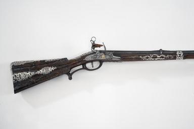 | Keywords: Snapplåsbössa, modalås - Livrustkammaren - 41102.tif Rund vid kammaren åttsidig blånerad pipa På kammaren guldstämplar träd omgivet av krönt lejon och varg Stöckel plansch IV 2 Manuel Sutil devotionskors samt fyra ornamentsstämplar i form av kors På anslutande faser tre ornamentsstämplar kors På svansskruvbladet graverad rankdekor Vid övergången mellan kammare och pipans främre del snidad dekor <br/>Riktmedel Gördelsikte och inlaxat korn av silver <br/>Fästning Pipan fäst med krysskruv näsband av silver fastskruvat i pipan samt tre genombrutna pipband av silver <br/><br/>Snapplås med plant låsbleck med fasade kanter krönt guldstämpel AL o // MAR // TI // NEZ Stöckelnr 745 S-formig hane med lös blånerad överkäke käkskruv med ring Hanskruv med huvud i form av snidad och graverad djävulsmask Slagstål med räfflad slagyta Låset täckt av graverad rankdekor bakom hanen en ängel Slagfjäder med randig polering <br/>Fästning och avtryckare <br/>Två låsskruvar Avtryckarbleck av stål med graverad dekor <br/><br/>Helstock av valnöt med snidad dekor inlagda trådar samt delvis genombrutna beslag av silver berain-stil Bakplåt med graverade rokokoornament samt lång tunga med reliefdekor antik krigare turk troféer mm Därframför beslag med medaljong med kvinnobyst På kindstödet beslag med graverade ryttare och hundar På kolven dessutom fem genombrutna reliefornament därav ett med jägare med två horn Tumplåt med relief i form av oval sköld med graverat sachsiskt vapen Sachsen-Meiningen-Hildburghausen enl vägl 1921 Sachsen-Weimar skölden omgiven av Gyllene skinnets ordenskedja samt vapentält krönt av kurfurstehatt Omkring vapnet troféer Genombrutet sidbleck med man i antik dräkt åkande musselvagn dragen av två lejon samt lurblåsande putto En beslagsskruv till låsblecket saknas På framstocken två större samt sex mindre genombrutna assymmetriska beslag De två främre pipbanden är samtidigt rörkor Laddstocksnoten delvis sluten Varbygel av stockens trä med beslag av silver med ciselerad och graverad dekor bl a kartusch med kvinnobyst <br/><br/>Tillbehör <br/>Laddstock av ljusare trä 1 1073 mm original caption snapplåsbössa modalås - LRK 2876 ca 1730 walnut A - ARMBORST material valnöt - steel e12 - eldvapen - pipa och lås material stål - silver e478 - eldvapen - riktmedel stockbeslag och stockdekor material silver - gold e5 - eldvapen - pipdekor material guld g 3140 size mm 1096 pipa size mm 1471 LRK Kaskel generalkonsul Allt för jakt 1975 AL o // MAR // TI // NEZ Stöckelnr 745 anv e2 - eldvapen - lås; Alonzo Martinez träd lejon o varg Stöckel IV 2 anv e1 - eldvapen - pipa; Manuel Sutil place of origin Madrid original filename lm_dig2433_2876 39486 inventory number LRK 2876 41102 CC-BY-SA Göran Schmidt <gallery caption Different images of same object > File Snapplåsbössa modalås v sida - Livrustkammaren - 49661 tif File Snapplåsbössa modalås pipstämplar mm - Livrustkammaren - 58222 tif File Snapplåsbössa modalås lås - Livrustkammaren - 66783 tif </gallery> Göran Schmidt Musket images from Livrustkammaren color images Flintlock muskets images from Livrustkammaren Media contributed by LSH dim-with multiple size templates Media contributed by LSH unmatched creator Color images from Livrustkammaren Media contributed by LSH 2013-10 |