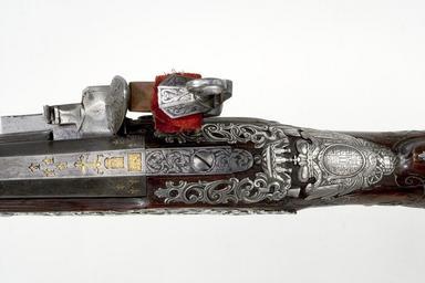 | Keywords: Snapplåsbössa, modalås, pipstämplar mm - Livrustkammaren - 58222.tif Rund vid kammaren åttsidig blånerad pipa På kammaren guldstämplar träd omgivet av krönt lejon och varg Stöckel plansch IV 2 Manuel Sutil devotionskors samt fyra ornamentsstämplar i form av kors På anslutande faser tre ornamentsstämplar kors På svansskruvbladet graverad rankdekor Vid övergången mellan kammare och pipans främre del snidad dekor <br/>Riktmedel Gördelsikte och inlaxat korn av silver <br/>Fästning Pipan fäst med krysskruv näsband av silver fastskruvat i pipan samt tre genombrutna pipband av silver <br/><br/>Snapplås med plant låsbleck med fasade kanter krönt guldstämpel AL o // MAR // TI // NEZ Stöckelnr 745 S-formig hane med lös blånerad överkäke käkskruv med ring Hanskruv med huvud i form av snidad och graverad djävulsmask Slagstål med räfflad slagyta Låset täckt av graverad rankdekor bakom hanen en ängel Slagfjäder med randig polering <br/>Fästning och avtryckare <br/>Två låsskruvar Avtryckarbleck av stål med graverad dekor <br/><br/>Helstock av valnöt med snidad dekor inlagda trådar samt delvis genombrutna beslag av silver berain-stil Bakplåt med graverade rokokoornament samt lång tunga med reliefdekor antik krigare turk troféer mm Därframför beslag med medaljong med kvinnobyst På kindstödet beslag med graverade ryttare och hundar På kolven dessutom fem genombrutna reliefornament därav ett med jägare med två horn Tumplåt med relief i form av oval sköld med graverat sachsiskt vapen Sachsen-Meiningen-Hildburghausen enl vägl 1921 Sachsen-Weimar skölden omgiven av Gyllene skinnets ordenskedja samt vapentält krönt av kurfurstehatt Omkring vapnet troféer Genombrutet sidbleck med man i antik dräkt åkande musselvagn dragen av två lejon samt lurblåsande putto En beslagsskruv till låsblecket saknas På framstocken två större samt sex mindre genombrutna assymmetriska beslag De två främre pipbanden är samtidigt rörkor Laddstocksnoten delvis sluten Varbygel av stockens trä med beslag av silver med ciselerad och graverad dekor bl a kartusch med kvinnobyst <br/><br/>Tillbehör <br/>Laddstock av ljusare trä 1 1073 mm original caption snapplåsbössa modalås - LRK 2876 pipstämplar mm ca 1730 walnut A - ARMBORST material valnöt - steel e12 - eldvapen - pipa och lås material stål - silver e478 - eldvapen - riktmedel stockbeslag och stockdekor material silver - gold e5 - eldvapen - pipdekor material guld g 3140 size mm 1096 pipa size mm 1471 LRK Kaskel generalkonsul Allt för jakt 1975 AL o // MAR // TI // NEZ Stöckelnr 745 anv e2 - eldvapen - lås; Alonzo Martinez träd lejon o varg Stöckel IV 2 anv e1 - eldvapen - pipa; Manuel Sutil place of origin Madrid original filename lm_dig2435_2876 39486 inventory number LRK 2876 58222 CC-BY-SA Göran Schmidt <gallery caption Different images of same object > File Snapplåsbössa modalås v sida - Livrustkammaren - 49661 tif File Snapplåsbössa modalås - Livrustkammaren - 41102 tif File Snapplåsbössa modalås lås - Livrustkammaren - 66783 tif </gallery> Göran Schmidt Musket images from Livrustkammaren color images Flintlock muskets images from Livrustkammaren Media contributed by LSH dim-with multiple size templates Media contributed by LSH unmatched creator Color images from Livrustkammaren Media contributed by LSH 2013-10 |