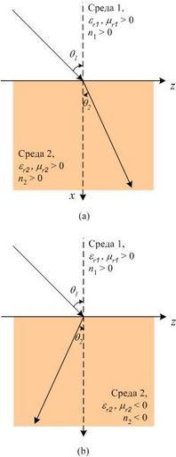 Keywords: Snell law Positive and Negative Refraction.jpg en Ray refraction between two mediums a Positive index of refraction - the transmitted ray in the second medium is placed on the opposite half-plane compared to the incident ray; b Negative index of refraction - the transmitted ray in the second medium lays in the same half-plave as the incident ray bg П ечупване на лъч на г аницата между две с еди a Положителен коефициент на п ечупване на вто ата с еда - във вто ата с еда п ечупеният лъч е отклонен в п отивоположната полу авнина оп еделена от но малата към г аничната повъ хност сп ямо падащия; b От ицателен коефициент на п ечупване на вто ата с еда - п ечупеният лъч е в същата полу авнина като падащия own Monganamu 16 Декемв и 2012г Cc-zero Refraction diagrams Metamaterials |