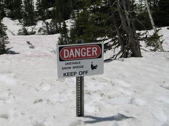 MAKE A MEME View Large Image David Restivo, NPS A sign warning of a dangerous snow bridge forming in June. Photo: David Restivo, NPS