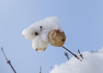 Keywords: snow covered withered winter season common snowberry berries white symphoricarpas albus toy torpedo cap meadow plant nature forest close-up macro shrub