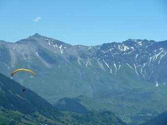 Keywords: snow mountain switzerland summer rock sunny green paragliding yellow