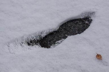 Keywords: snow new zealand winter white black tar asphalt footprint shoe print cold frozen leaf birch leaf