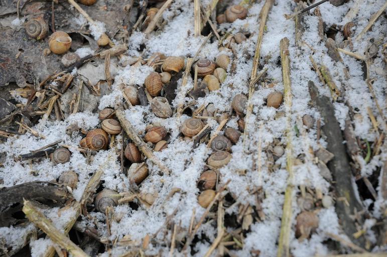 Keywords: snow snails shell ground forest brown white wintry winter cold