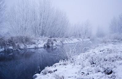 Keywords: snow winter landscape branches grass fog river water frost