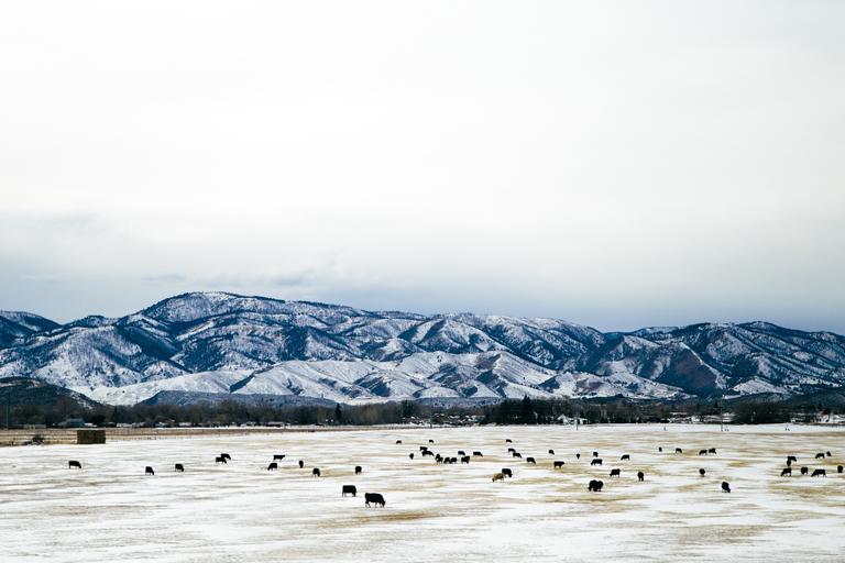 Keywords: snowy mountains cattle farm snow animal farming landscape pasture mountains winter meadow livestock graze farmland ranch herd countryside