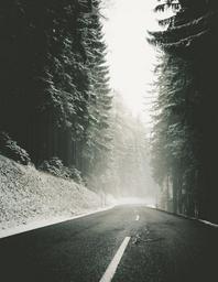 Keywords: snowy roadway road winter drive foggy morning wintertime driving clouds snow-covered black and white white adventure forest
