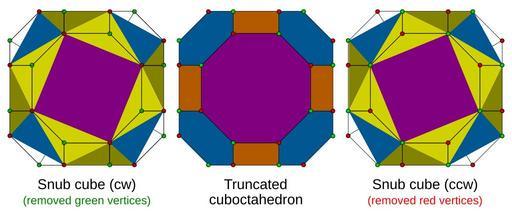 | Keywords: Snubcubes in grCO.svg Two snub cubes inside a truncated cuboctahedron en Image Snubcubes in grCO png 2007-04-09 Traced by User Stannered thinking by Tom Ruen PD original en Image Snubcubes in grCO png Credit This set of images created to demonstrate the snub cube as an alternation operation was modified from images provided by Dr Richard Klitzing for Wikipedia and converted to SVG Created with Inkscape Snub cubes left and right Truncated cuboctahedron en English Wikipedia Tomruen | ||||