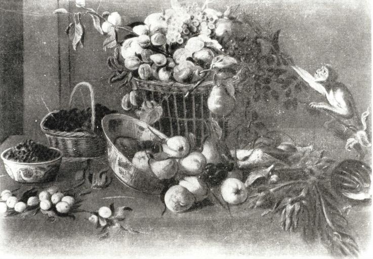 | Keywords: Snyders Monkey Among Fruit.JPG  A Monkey Among Fruit Małpa wśród owoców Creator Frans Snyders s 1640 oil canvas cm 111 157 Catalogue of paintings removed from Poland by the German occupation authorities during the years 1939-1945 1 Foreign paintings / comp Władysław Tomkiewicz ; Ministry of Culture and Art Warsaw 1950 Editor Ministry of Culture and Art See also http //kolekcje mkidn gov pl/ Department of National Heritage Wartime losses an official webpage of Polish Ministry of Culture Art and National Heritage PD-Art PD-old-100 Still life paintings by Frans Snyders 17th-century foreign paintings lost in Poland during World War II 17th-century still life paintings in Poland 1640s still life paintings Paintings of monkeys |