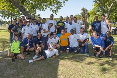 | Keywords: Soccer match with Brazilian navy 140806-N-MD297-552.jpg en Sailors assigned to future amphibious assault ship USS America LHA 6 and Brazilian sailors pose for a group photo after playing a friendly soccer match while the ship made a scheduled port visit to Rio de Janeiro America is currently traveling through the U S Southern Command and U S 4th Fleet area of responsibility on her maiden transit America visits the Americas America is the first ship of its class replacing the Tarawa-class of amphibious assault ships As the next generation big-deck amphibious assault ship America is optimized for aviation capable of supporting current and future aircraft such as the MV-22 Osprey and F-35B Joint Strike Fighter The ship is scheduled to be ceremoniously commissioned Oct 11 in San Francisco U S Navy photo by Mass Communication Specialist 3rd Class Huey D Younger Jr /Released 2014-08-06 Petty Officer 3rd Class Huey Younger https //www dvidshub net/image/1496139 140806-N-MD297-552 2014-08-11 13 11 RIO DE JANEIRO BR PD-USGov-Military-Navy MV-22B Osprey Crew of USS America LHA-6 Images from DoD uploaded by Fæ |