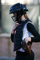 Keywords: softball catcher girl catcher's mask glove game player competition play ballgame sport black helmet uniform female concentration thoughtful field american concentrating