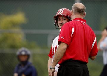 Keywords: softball coaching coach player helmet batter team field sports game competition young teenager red people activity athlete adult female smiling