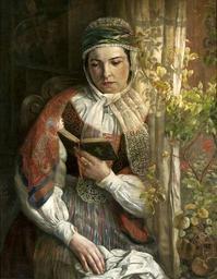 | Keywords: Sokołowski A woman in folk costume.jpg Artwork Creator Zygmunt Sokołowski s 1880 oil canvas cm 99 5 70 Institution National Museum Warsaw Not on view accession number MP 1290 object history credit line Z Sokolowski signature bottom left http //cyfrowe mnw art pl/dmuseion/docmetadata id 15969 show_nav true full_screen true cyfrowe mnw art pl See below PD-old-100 DEFAULTSORT 1880s; A woman in folk costume reading Zygmunt Sokołowski 19th-century Polish paintings in the National Museum in Warsaw Realist paintings in the National Museum in Warsaw National costume of Poland in art |