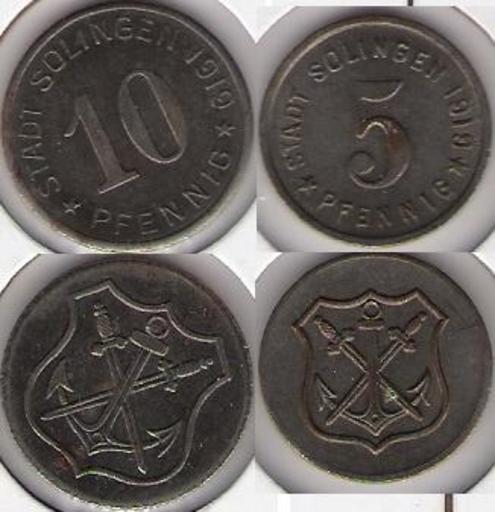 Keywords: SOL001.JPG Solingen 5 y 10 pfennig 1919 Solingen 5 and 10 pfennig 1919 2006-09-17 own assumed B25es Notgeld coins of Solingen History of Solingen 1919 coins