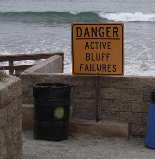 Keywords: Solanabeach-activeblufffailures.jpg en Active bluff failures sea bluff erosion at Fletcher Cove Solana Beach California USA own Stickpen 2010-09-11 public domain Beaches of California Beach signs in California Danger signs