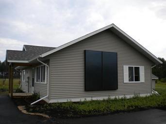 | Keywords: Solar Air Heat Collector.JPG en Typical residential installation of two Rural Renewable Energy Alliance Solar Powered Furnaces Model SPF32 glazed back-pass flat-plate solar thermal air heat collectors mounted seamlessly in parallel on south facing wall of 2009 Habitat for Humanity home in Minnesota for optimum heating season performance http //www rreal org/ Creator Bicycling Benjamin 2009-07-07 Check categories 2010 August 15 en wikipedia Solar_air_heat Carbon Architecture 7 Solar hot water panels |