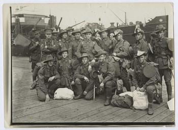 | Keywords: soldiers men wwi firstworldwar world war i worldwari troops troopship hmat nestor hmatnestor melbourne 5th battalion aif 5thbattalionaif kew australian troops australiantroops australian troops go to war australiantroopsgotowar photo border Soldiers awaiting transport at Kew, Melbourne, Victoria, Australia, c 1915. This black and white photograph depicts a group portrait of soldiers on a wharf waiting to embark. The men in the front row are kneeling and two of them have white kit bags. Several soldiers have scarves wrapped around their slouch hats and a flag is being held by the soldier at left. A troopship can be seen behind the group. The reverse of the print has the handwritten inscription `Nestor punch 3' in lead pencil. The inscription refers to the troopship NESTOR which carried Australian troops in WW1. The soldier kneeling in the front row, far right carries a kit bag reading: 'R. V. Matthews (?) N 6534'. Reginald Vernald Matthews embarked from Melbourne on 2 October 1916 onboard HMAT NESTOR for service with the 5th Battalion AIF. The Australian National Maritime Museum undertakes research and accepts public comments that enhance the information we hold about images in our collection. If you can identify a person, vessel or landmark, write the details in the Comments box below. Photographer: J.E. Barnes Object number: 00027604 Soldiers awaiting transport at Kew, Melbourne, Victoria, Australia, c 1915. This black and white photograph depicts a group portrait of soldiers on a wharf waiting to embark. The men in the front row are kneeling and two of them have white kit bags. Several soldiers have scarves wrapped around their slouch hats and a flag is being held by the soldier at left. A troopship can be seen behind the group. The reverse of the print has the handwritten inscription `Nestor punch 3' in lead pencil. The inscription refers to the troopship NESTOR which carried Australian troops in WW1. The soldier kneeling in the front row, far right carries a kit bag reading: 'R. V. Matthews (?) N 6534'. Reginald Vernald Matthews embarked from Melbourne on 2 October 1916 onboard HMAT NESTOR for service with the 5th Battalion AIF. The Australian National Maritime Museum undertakes research and accepts public comments that enhance the information we hold about images in our collection. If you can identify a person, vessel or landmark, write the details in the Comments box below. Photographer: J.E. Barnes Object number: 00027604 |