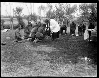 | Keywords: blackandwhite monochrome outdoor black and white Soldiers and New Zealand Chaplain celebrating Holy Communion near the firing line, Messines Ridge, Belgium, during World War I. Photograph taken 1917 by Henry Armytage Sanders. Inscriptions: Inscribed - Photographer's title on negative -bottom right: H70. Quantity: 1 b&w original negative(s). Physical Description: Dry plate glass negative 4 x 5 inches Soldiers at a communion service near the firing line, Messines Ridge, Belgium. Royal New Zealand Returned and Services' Association :New Zealand official negatives, World War 1914-1918. Ref: 1/2-012781-G. Alexander Turnbull Library, Wellington, New Zealand. natlib.govt.nz/records/23209516 Soldiers and New Zealand Chaplain celebrating Holy Communion near the firing line, Messines Ridge, Belgium, during World War I. Photograph taken 1917 by Henry Armytage Sanders. Inscriptions: Inscribed - Photographer's title on negative -bottom right: H70. Quantity: 1 b&w original negative(s). Physical Description: Dry plate glass negative 4 x 5 inches Soldiers at a communion service near the firing line, Messines Ridge, Belgium. Royal New Zealand Returned and Services' Association :New Zealand official negatives, World War 1914-1918. Ref: 1/2-012781-G. Alexander Turnbull Library, Wellington, New Zealand. natlib.govt.nz/records/23209516 |