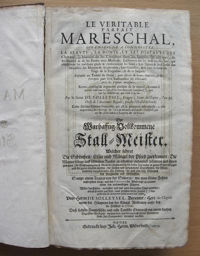 | Keywords: Solleysel - Der Warhafftig-Vollkommene Stall-Meister.jpg Jacques de Solleysel 1617 “1680 Le Veritable Parfait Mareschal Qvi Enseigne A Connoistre La BeavtĂ© La BontĂ© Et Les Deffavts Des Chevaux ¦ Der Warhafftig-Vollkommene Stall-Meister Welcher lehret die Schönheit GĂĽte und Mängel der Pferd zuerkennen ¦ Diese sechĂźte Frantzösische und erste Teutsche Edition ist mit einem kurtzen Begriff der Reitkunst welchen einer von den vortrefflichsten Bereuttern dieser Zeit Componiert vermehrt worden Genff Widerhold 1677 Exemplar der Niedersächsischen Staats- und Universitätsbibliothek Göttingen Signatur 2 OEC I 2807 1677 own photograph Jacques de Solleysel PD-old-100 |