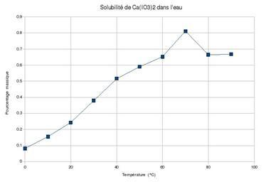 | Keywords: Solubilité de Ca(IO3)2 dans l'eau.png fr Solubilité du iodate de calcium dans l'eau Créée par mes soins avec OpenOffice org Calc et The Gimp d'après http //www hbcpnetbase com/ Handbook of Chemistry Physics Epop Aqueous solubility curves Calcium compounds Iodates |