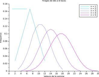 | Keywords: Somme n tirages d6 1 a 5.svg fr Fréquence d'apparition des valeurs pour la somme de n dés à six faces nd6 Illustration du théorème central limite Créé avec Scilab modifié avec Inkscape en Frequency of occurrence of the values for the sum of n six-sided dice nd6 Illustration of the central limit theorem Created with Scilab modified with Inkscape 2013-06-18 11 35 41 own Cdang cdang Scilab source <source lang scilab > // Trace la fonction de densité de la moyenne de n tirages de dés à 6 faces // initialisation clear; clf; nbmax 5; // nombre max de tirages cmap coolcolormap nbmax ; xset colormap cmap ; // Fonctions function frequences tirages n // calcule les fréquences de n tirage de dés par dénombrement // entrées n nombre de tirages entier // sorties frequences matrice de fréquences réels N 6 n; // nombre de valeurs possibles resultats zeros N n ; // initialisation résultats des tirages for i 1 n // n° de colonne k 6 n - i ; //à la colonne i on alterne k valeurs 0 et k valeurs 1 for j 0 6 i - 1 - 1 for jj 1 6 resultats 6 j + jj - 1 k + 1 6 j + jj k i jj; end end end //disp resultats ; somme sum resultats c ; frequences_non_triees tabul somme ; frequences gsort frequences_non_triees lr i ; frequences 2 frequences 2 /N; // normalisation des fréquences endfunction // Programme principal for i 1 nbmax XY tirages i ; plot2d XY 1 XY 2 style i end axe gca ; xtitle Tirages de dés à 6 faces Valeurs de la somme Fréquence legend n 1 n 2 n 3 n 4 n 5 n 6 n 7 n 8 n 9 n 10 n 11 n 12 </source> cc-zero Uploaded with UploadWizard Dice probability Central limit theorem |