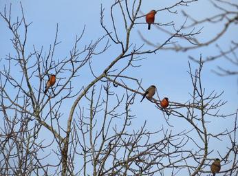 Keywords: songbirds birds gimpel tree