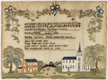 | Keywords: Sophia Stevens Smith - Sampler - Google Art Project.jpg 1804 1881 Sophia 6793948 Stevens Smith 1804 - 1881 /collection/cooper-hewitt-national-design-museum/artwork/sampler-sophia-stevens-smith/6855214/ 152485 Sophia Stevens Smith /artist/sophia-stevens-smith/29120170/ 29120170 /collection/cooper-hewitt-national-design-museum/ Cooper-Hewitt National Design Museum 3644669 http //www cooperhewitt org/ /collection/cooper-hewitt-national-design-museum/artwork/sampler-sophia-stevens-smith/6855214/ 1818 1818 Medium silk embroidery and paint on cotton foundationTechnique embroidered in cross satin stem surface satin chain and knot stitches on plain weave foundation By 1941 Mrs Henry E Coe Eva Johnston Coe 1941 - 1974 Rosalie Coe 1974 Cooper-Hewitt Museum 440 6855214 False 1818 1974-42-17 http //collection cooperhewitt org/view/objects/asitem/id/152485 Bequest of Rosalie Coe from the collection inherited from her mother Eva Johnston Coe Sampler 1810 1820 w595 x h440 cm 1818 False 1 35809018567639 Object sampler-sophia-stevens-smith Sampler s 595 Ethel Stanwood Bolton and Eva Johnston Coe American Samplers Boston The Massachusetts Society of the Colonial Dames of America 1921 224 plate LXVIII H x W 43 8 x 59 7 cm 17 1/4 x 23 1/2 in August 5 1818 Sophia Stevens Smith Aged 14 years Medium silk embroidery and paint on cotton foundationTechnique embroidered in cross satin stem surface satin chain and knot stitches on plain weave foundation By 1941 Mrs Henry E Coe Eva Johnston Coe 1941 - 1974 Rosalie Coe 1974 Cooper-Hewitt Museum special url_id lwGH0Ul0hueIrg PD-old-100-1923 1881 Google Art Project works by Sophia Stevens Smith Google Art Project works in Cooper-Hewitt Smithsonian Design Museum Uncategorized 2015 March 30 |