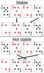 | Keywords: Sorting stability playing cards.svg en An example of stable sorting on playing cards When the cards are sorted by rank with a stable sort the two 5s must remain in the same order in the sorted output that they were originally in When they are sorted with a non-stable sort the 5s may end up in the opposite order in the sorted output own based on File Cards-2-Heart svg File Cards-7-Spade svg File Cards-5-Spade svg File Cards-5-Heart svg User Dcoetzee User WDGraham 2013-04-19 Sort algorithms Playing cards Cc-zero |