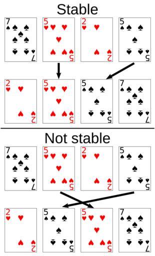 | Keywords: Sorting stability playing cards.svg  en An example of stable sorting on playing cards When the cards are sorted by rank with a stable sort the two 5s must remain in the same order in the sorted output that they were originally in When they are sorted with a non-stable sort the 5s may end up in the opposite order in the sorted output own based on File Cards-2-Heart svg File Cards-7-Spade svg File Cards-5-Spade svg File Cards-5-Heart svg User Dcoetzee User WDGraham 2013-04-19 Sort algorithms Playing cards Cc-zero |