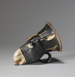 | Keywords: Sotades Painter - Red-Figure Rhyton - Walters 482050 - Side B.jpg In ancient times wine was thought to bring out the wild side of people temporarily freeing them from the rules and structure of civilized life This rhyton a drinking cup is formed of two animals' heads the left half a ram and the right half a donkey Double-faced vases like this one evoked characteristics viewed as polar opposites Rams were prized for religious sacrifices while donkeys symbols of potent sexuality were never sacrificed because their flesh was too tough Around the neck of the cub is a scene of satyrs cavorting ca 450 BC Classical red-figure ceramic cm 17 5 11 7 ; cm 11 diam accession number 48 2050 20024 Nicolas Koutoulakis Galerie Segredakis Paris Walters Art Museum 1952 by purchase Museum purchase with funds provided by the S A P Fund 1952 In Search of Ancient Treasure 40 Years of Collecting The Walters Art Gallery Baltimore 1978 place of origin Athens Greece Walters Art Museum license Ram shaped Rhyton by the Sotades Painter in Baltimore Ancient Greek pottery rhyta |