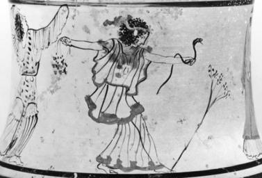 | Keywords: Sotheby Painter - White-Ground Pyxis with Maenads - Walters 482019 - Detail E.jpg Maenads women who have left their homes to follow the wine-god Dionysus dance around this pyxis or cosmetics container The animal-skin garments snakes and vine leaves are typical attributes of maenads and indicate their association with the wild Dionysian realm ca 460 450 BC Classical terracotta cm 20 1 ; cm 14 3 diam accession number 48 2019 30136 Sale Sotheby's London December 7 1920 Joseph Brummer Brummer Estate Sale Parke-Bernet Galleries New York June 8-9 1949 part III lot 12 fig 1 Walters Art Museum 1949 by purchase Museum purchase 1949 In Search of Ancient Treasure 40 Years of Collecting The Walters Art Gallery Baltimore 1978 Pandora's Box Women in Classical Greece The Walters Art Gallery Baltimore; Dallas Museum of Art Dallas; Antikenmuseum Basel und Sammlung Ludwig Basel 1995-1996 place of origin Athens Greece Walters Art Museum license Ancient Greek pottery in the Walters Art Museum Sotheby Painter Media contributed by the Walters Art Museum needs category review Ancient Greek pottery pyxides |
