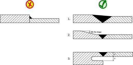 | Keywords: Soudage pieces epaisseurs differentes.svg en Welding parts which have different thicknesses left wrong solution; right agood solutions Small difference of thickness Back chamfering with a small angle Relief groove fr Soudage de pièces dépaisseur différente gauche mauvaise solution ; droite bonnes solutions Cas d'une faible différence d'épaisseur Délardage Rainure de décharge 2012-05-09 own + modified versions of File Artículo bueno svg and File Symbol speedy delete vote svg different colours Cdang inkscape cc-zero Uploaded with UploadWizard Welding diagrams |