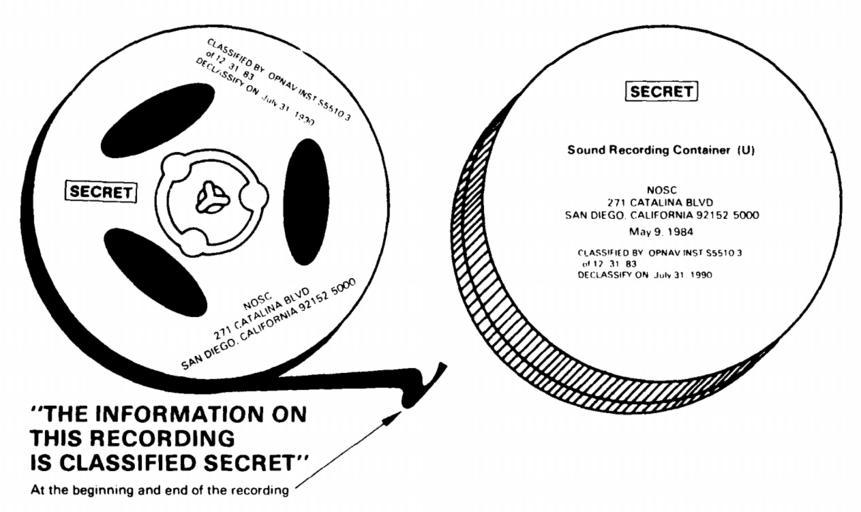 | Keywords: Sound recordings and containers (2).png en An audible statement of the overall classtfication is placed at the beginning and end of the recording The reel or cassette and the container are marked with the other appropriate markings 1988-08 http //www dtic mil/dtic/tr/fulltext/u2/a200314 pdf Security Is Everybody ™s Business Technical Document 490 Revision B page A-26 Graydon J Gerber Naval Ocean Systems Center NOSC San Diego California PD-USGov-Military-Navy LicenseReview http //www dtic mil/dtic/tr/fulltext/u2/a200314 pdf Security Is Everybody ™s Business Technical Document 490 Revision B page A-26 Natuur12 2013-12-02 This publication is a security overview It supersedes the NELC pamphlet Security Is Everybody ™s Business and NOSC Technical Document 490 Revision A Security Training It provides basic security principles and procedures to ensure uniformity and effectiveness in implementing the Naval Ocean Systems Center ™s security program <br>Note All classification markings on sample documents contained herein are for training purposes only; United States secrecy routine Uploaded with UploadWizard Sound recording |