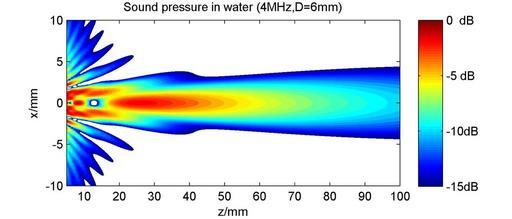 | Keywords: Soundfield Water 4MHz TransducerRadius3mm.png en Sound field of an unfocused ultrasonic transducer f 4MHz ultrasonic frequency D 6mm transducer diameter harmonic excitation calculated by using the Rayleigh Integral de Schallfeld eines runden ebenen Ultraschallwandlers f 4MHz Ultraschallfrequenz D 6mm Durchmesser ; Berechnung für harmonische Anregung auf Grundlage des Rayleigh-Integrals own Michael Lenz date Ultrasonic transducers | ||||