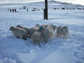 | Keywords: Sourton snowfall 7 February 2009 6.JPG A picture taken on Dartmoor near Sourton about 4 miles 6 km south-west of Okehampton showing a group of sheep huddling together for warmth It shows the heavy snowfall that covered much of Devon on 6 February 2009 Sourton Tor is shown in the background to the right and Shelstone Tor to the left Sheep farmers on Dartmoor can let their sheep roam around freely without enclosed fields The farmers therefore mark their sheep with paint such as the blue and red paint seen on the sheeps' necks so they know which sheep belong to which farmer Own 2009-02-07 Jolly Janner 50 42 3 N 4 3 50 W February 2009 Great Britain and Ireland snowfall Tors of Dartmoor Sheep in Dartmoor Snow in Dartmoor Sourton |