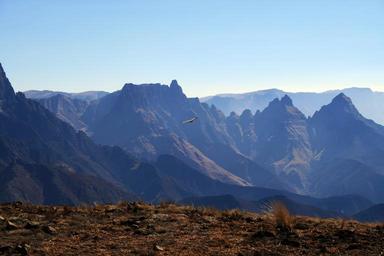 Keywords: south africa cathedral peak mountains eagles peaks drakensberg grass sky rocks valley winter haze