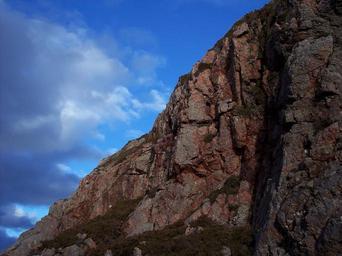 Keywords: south rona crag craggy mountain face rugged bare steep sky blue clouds scotland