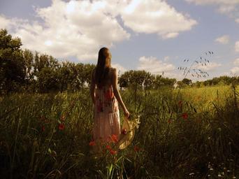 Keywords: south spacer woman green tree meadow hat at noon go nature flowers poppies