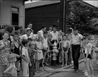 | Keywords: SouthBroadSummerShowers1940HydrantCrowd.jpg New Orleans 1940 For the fifth consecutive year the WPA recreation project begins its summer showers program Boys and girls of New Orleans will cool off at seventeen locations in the city The formal opening of the program shown here was held at the fire station at 231 South Broad Street Lieutenant Bat Otillio; Pipeman Richard Cochran Engine House 26 Hook Ladder 9; and Barbara Lee Grager age 2 Exterior The Summer Showers Program provided sprays of water at fire stations for children to play and cool off in Works Progress Administration photo via http //www nutrias org/~nopl/photos/wpa/wpa36 htm 1940-07-01 Uncredited WPA photographer PD-USGov 1940 in New Orleans Broad Avenue New Orleans Children of the United States Fashion in 1940 Mid City New Orleans 1940s swimwear Fire hydrants in New Orleans Firefighters in Louisiana Water curtains |