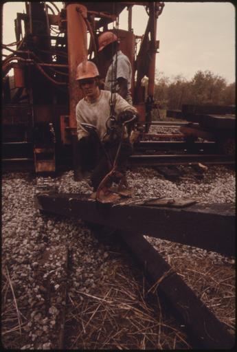 Keywords: SOUTHERN RAILWAY RIGHT-OF-WAY WORKER AND MACHINERY. THE MACHINE JACKS UP THE RAILS, PULLS OUT THE OLD CROSSTIES AND... - NARA - 556903.jpg Scope and content General notes 556903 Local identifier 412-DA-14451 Environmental Protection Agency 12/02/1970 - NARA-Author Pickerell Jim 1936- Photographer 4588217 <br /> Alexandria Va 4200827 38 8 -77 033 <br /> Still Picture Records Section Special Media Archives Services Division NWCS-S National Archives at College Park 8601 Adelphi Road College Park MD 20740-6001 10/1974 Record group Record Group 412 Records of the Environmental Protection Agency 1944 - 2006 Record group ARC 708 DOCUMERICA The Environmental Protection Agency's Program to Photographically Document Subjects of Environmental Concern compiled 1972 - 1977 Series ARC 542493 File unit File unit ARC Variant control numbers Agency-Assigned Identifier 241/51/014451<br /> NAIL Control Number NWDNS-412-DA-14451 Other versions <gallery> File SOUTHERN_RAILWAY_RIGHT-OF-WAY_WORKER_AND_MACHINERY _THE_MACHINE_JACKS_UP_THE_RAILS _PULLS_OUT_THE_OLD_CROSSTIES_AND _-_NARA_-_556903 tif tif File SOUTHERN_RAILWAY_RIGHT-OF-WAY_WORKER_AND_MACHINERY _THE_MACHINE_JACKS_UP_THE_RAILS _PULLS_OUT_THE_OLD_CROSSTIES_AND _-_NARA_-_556903 jpg jpg </gallery> NARA-cooperation PD-USGov Southern Railway US construction |