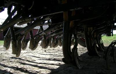 Keywords: Sowing machine detail.jpg Information Drill coulters on a combined grain and fertilizer sowing machine Fertilizer coulters front and grain coulters rear own 2007-05-02 Mahlum Seed drills