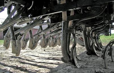 Keywords: Sowing machine detail A.jpg Drill coulters on a combined grain and fertilizer sowing machine Fertilizer coulters front and grain coulters rear own 2007-05-02 Mahlum Seed drills