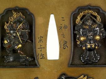 | Keywords: Soyo - Tsuba with Marishiten and Atago Jizô - Walters 51104 - Mark B.jpg At the top of the tsuba are seven stars from the constellation Ursa Major The deity Marishiten was believed to reside in Ursa Major and she is depicted in the left cartouche Marishiten is shown standing on a running boar with a bow and arrow in her hands She has three heads and six arms She was worshipped by warriors in pre-modern Japan At the right is the deity Atago Jizô He is sometimes called Shogun Jizô and protected warriors This manifestation of Jizô can also be linked to Maritshiten because his animal messenger is the boar Gingko leaves and two pigeons are at the bottom On the reverse is another pigeon and a bow and arrow 2nd quarter 19th century late Edo-Meiji sentoku shibuichi copper gold cm 8 7 3 accession number 51 104 39682 Henry Walters Baltimore date and mode of acquistion unknown Walters Art Museum Henry Walters Acquired by Henry Walters Signature Nishin kore no zo/Soyo saku; Signature Shia u tsuku ru /Tobari Yoshihisa; Translation These are images of two deities/Made by Soyo; Translation Made together with Tobari Yoshihisa place of origin Edo present-day Tokyo Japan Walters Art Museum license Tsuba in the Walters Art Museum Media contributed by the Walters Art Museum needs category review Media contributed by the Walters Art Museum needs artist review Marici |